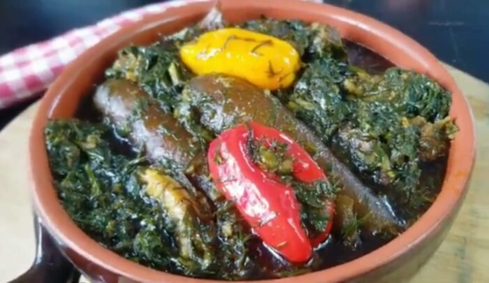 Eru Soup, made with spinach or water leaves is a nutritious and delicious dish packed with protein (beef, beef skin) and smoked fish that will delight your taste buds. Served with ‘Fufu’ 0r ‘Garri’